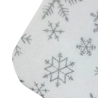 Add this gorgeous holiday stocking with multiple snowflakes to your holiday decor this year! Perfect to place all of your holiday goodies in, while adding some sparkle to your mantles. Simply hang on your stairways, holiday tree or bedpost.Product Features:Traditional white holiday stocking Designed with a folded white cuffVarious sparkling silver snowflakesStocking has a one-sided designComes ready-to-hang on a matching white loopRecommended for indoor decorative use onlySpot clean with mild detergent; do not washDimensions: 19″H x 10″W x .5″DMaterial(s): polyester