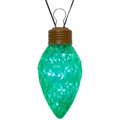 Light up your holiday with these festive jumbo, faceted C9 style holiday lights. These retro looking lights boast the nostalgia of the traditional C9 design, with the energy-efficiency and long-lasting benefits of LED technology. Each bulb cover is filled with a 10 count, clear light set. Perfect for making a bright, bold holiday statement.Product Features:Color: clear bulbs / black wireFaceted Bulb covers: blue, red, yellow, green, clearNumber of bulbs on string: 10 lights in each bulb cover for a total of 50 lightsBulb size: mini wide angleBulb type: LEDSpacing between each bulb cover: 36”Lighted length: 12’Total length: 17’60” lead cordAdditional Product Features:Commercial size light setEasy to hang from metal loopsLED lights use 90% less energy Cool to the touch Recommended for indoor use or outdoors under covered area Rainproof adapterWire gauge: 22120 volts, 60 hertz, .08 amps, 0.0 wattsDimensions: Bulb covers: 9″ high x 4.25″ diameterMaterial(s): plastic/wire/metal