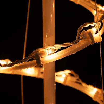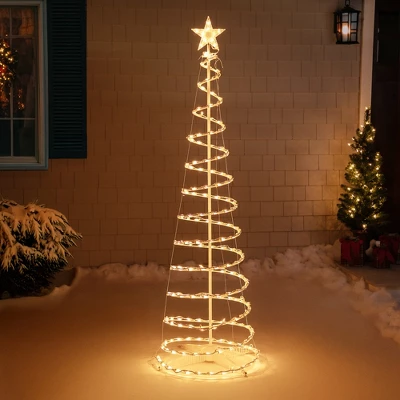 This beautiful spiral cone tree is the perfect addition to your holiday yard decor. Create your own wonderland by effortlessly adding a soft, warm glow in a unique and modern way. The tree contains an abundance of clear incandescent mini lights, that are UL listed for both indoor and outdoor use. Perfect for any area of your home or yard that needs a special holiday touch. The easy assembly allows for a quick and effortless setup, and the included lawn stakes allow you to secure the tree into the ground. Product Features: Color: clear bulbs / white wire Number of bulbs: 200 Bulb size: mini 72″ white lead cord Quick and easy assembly Additional Product Features: Lighted crystalline star tree topper UL certified and approved for indoor or outdoor useIncludes pole with stand and ground stakesContains 1 plug with end connector, which allows you to stack multiple items together (not to exceed 210 watts) Wire gauge: 22 120 volts, 60 hertz, .48 amps, 57.6 watts Dimensions: 6′ high (from the bottom of the stand to the top of the tree)22″ base diameter (at widest point) Material(s): metal/wire/plastic/glass bulbs